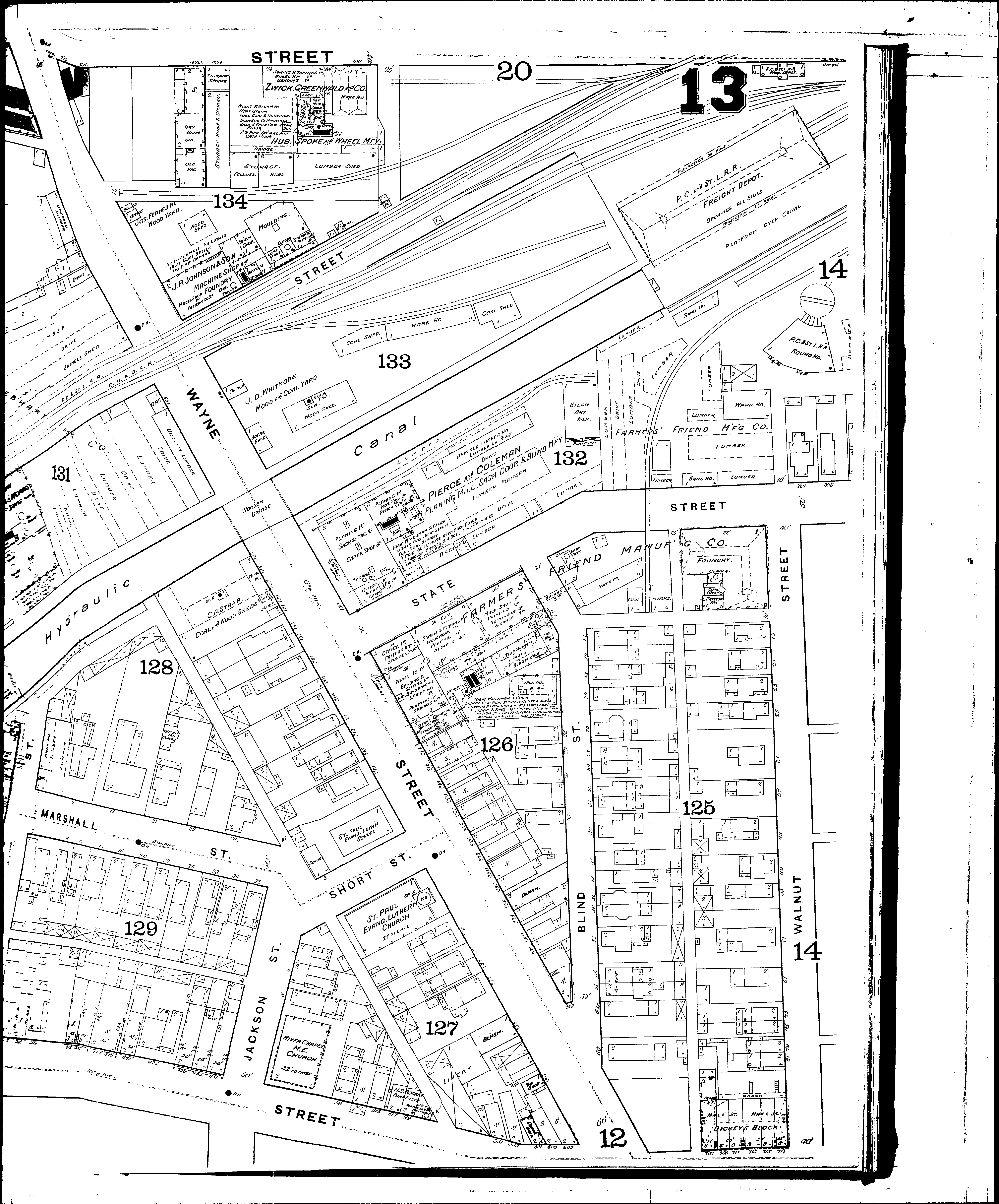 Locations: Banner Mills Barnes, R., Cigar Box Factory Bates, D. L., & Bro., Machine Shop Beaver B. N., Sash & Blind Fact Boyce Furnace Works Brown, N. B., & Co., Mfg Wagon Materials Buckeye Bottling Works Buckeye Brass Works Buckeye Iron & Brass Works Chadwick & Francisco, Iron Fence Works Crawford, McGregor & Co., Last & Peg Manufactory Davis, J. P., Lard Oil Works Dayton City Elevator Dayton City Mills Dayton Steam Dye Works Dickeys Block Durst, J. W., Mill & Elevator Edmonson, J., Fence Works Farmers Friend Mfg Co Fernedine, J., Wood Yard Ferneding, H., & Son, Malt House Gebhart, A., & Co., Lumber Yard Gebhart, J.R., & Son, Flour Mills Gerber & Kellner, Dye Works Johnson, J. R., & Son, Mach. Shop Joyce, Cridland & Co., Mach. Shop Meth. Epis. Church, River Chapel Miami Lard Oil Works National Cornice Works Neff & Bennett, Stove Works Ohio Rake Company Pierce & Coleman, Planing Mill P. C. & St. L. R. R., Freight Dept P. C. & St. L. R. R., Round House Pope, H., L. & Co., Linseed Oil Mills Pritz & Kuhn, Machine Works Rockey, H. S., Pump Factory Ronzer, J., Sash & Blind Factory Sachs, Pruden & Co., Bottling Wks St. Pauls Ev. Luth. Church & School Starr, C. A., Coal & Wood Yards Walker & Walker, Printing House Whitmore, J. D., Wood & Coal Y Wood, Archer & Co., Linsd Oil Wks Zingle, A., Box Factory Zwick, Greenwald & Co., Hub. & Spoke Factory
