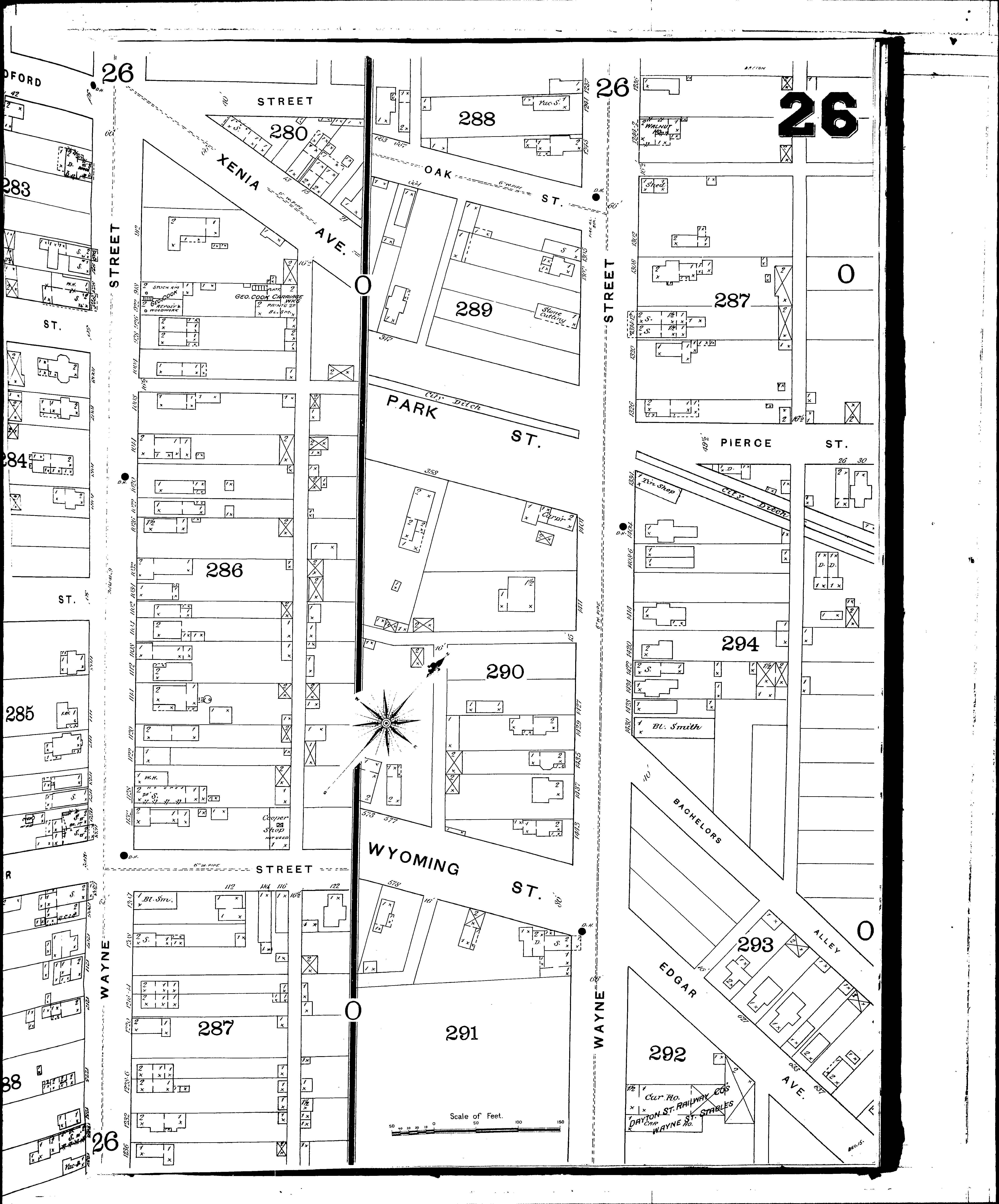 Streets: Adams [530-547] Bachelors Alley, near Wayne Bradford [27-130] Clover, W [59-122] Eagle, near Richard Edgar [600-645] Herman [602-625] Hickory [623-640] Johnson [325-340] Monroe [597-620] Oak [663-678] Park [347-360] Pearl, near Wayne Pierce [1-32] Richard [643-728] Wayne [601-1540] Wyoming [573-590] Xenia Ave [1-30]