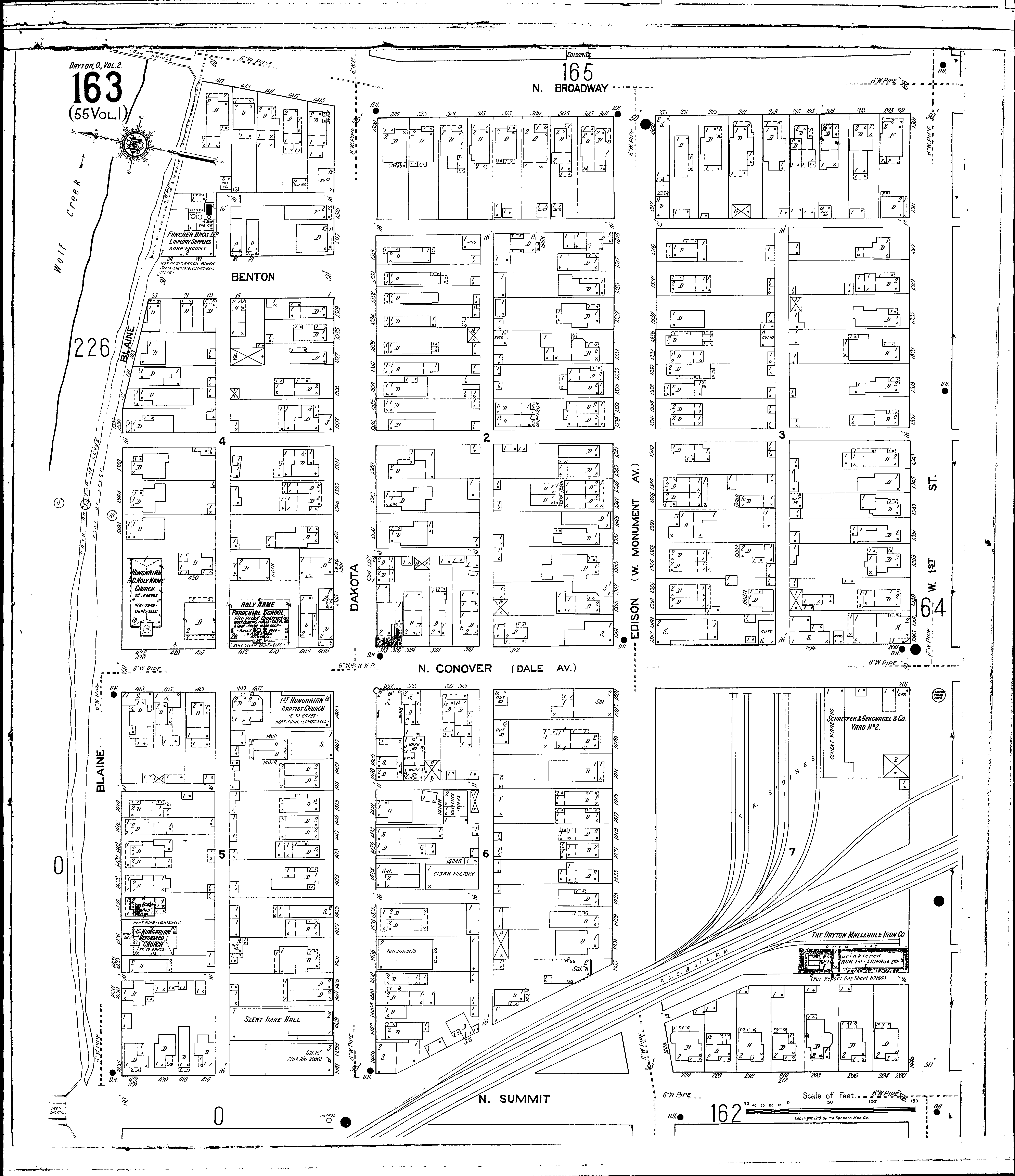 Locations: Dayton Malleable Iron Co Fancher Bros., Ltd., Laundry Supplies First Hungarian Baptist Church Holy Name Parochial School Hungarian Reformed Church Hungarian R. C. Holy Name Church Schaeffer & Gengnagel & Co., Warehouse and Yard No. 2