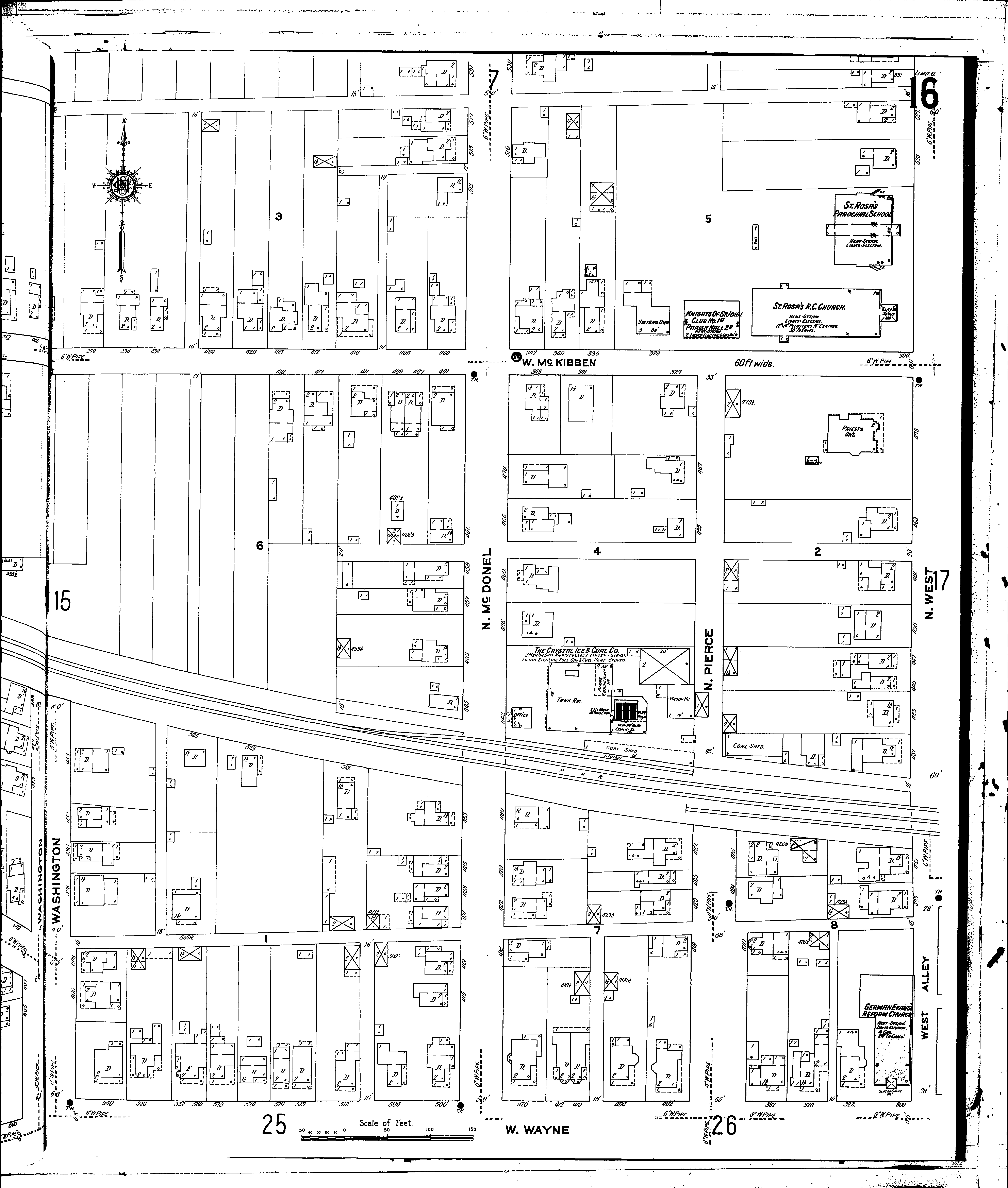 Streets: McDonel, N [400-533] KcKibben, W [300-444] Pierce, N [400-483] Washington [400-438] Wayne, W [318-540] West, N [423-531] West, Alley [401-423]
