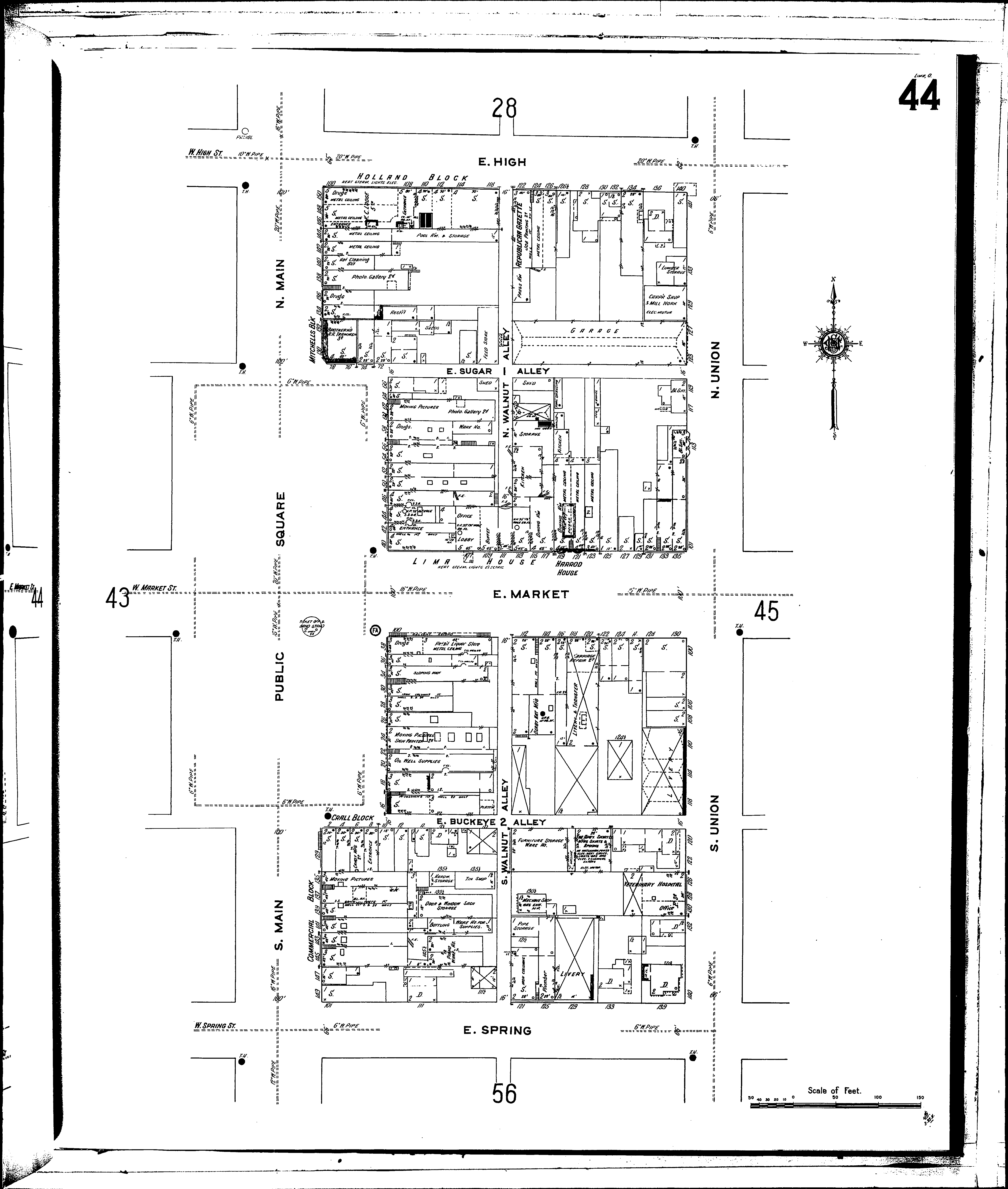 Streets: Buckeye Alley, E High, E [100-140] Main, N [130-150] Main, S [129-149] Market, E [100-135] Public Square [2-78] Spring, E [101-139] Sugar, Alley, E Union, N [101-141] Union, S [100-140] Walnut Alley, S