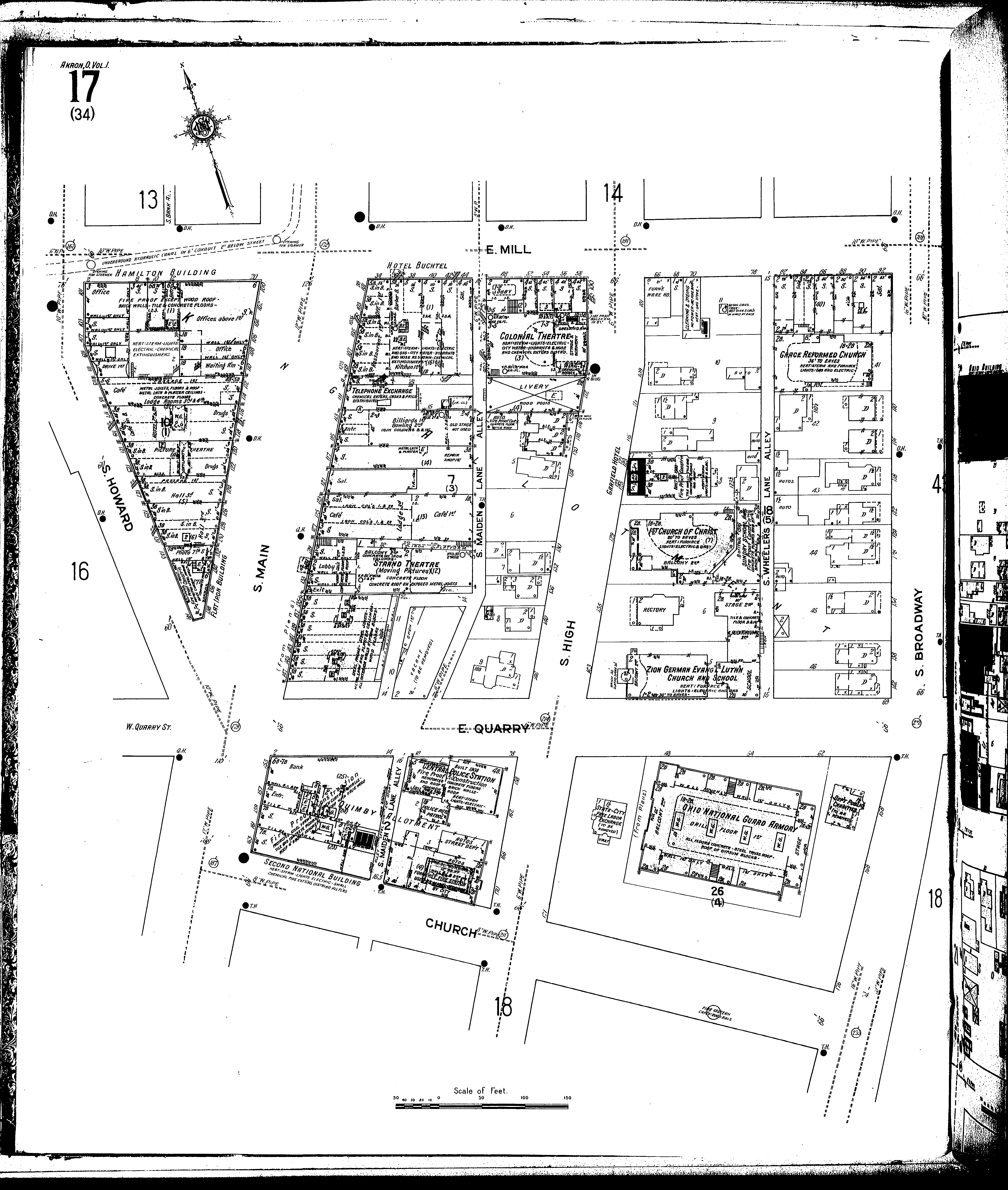 Locations: Armory O. N. G., E. Quarry St Central Police Station Colonial Theatre Department of Public Charities First Church of Christ Flat Iron Building Garfield Hotel Grace Reformed Church Hamilton Building Hotel Buchtel Police Department, Central Station Second National Building State-City Free Labor Exchange Strand Theatre, Moving Pictures Telephone Exchange, 111 S. Main St Zion German Ev. Luth. Church and School