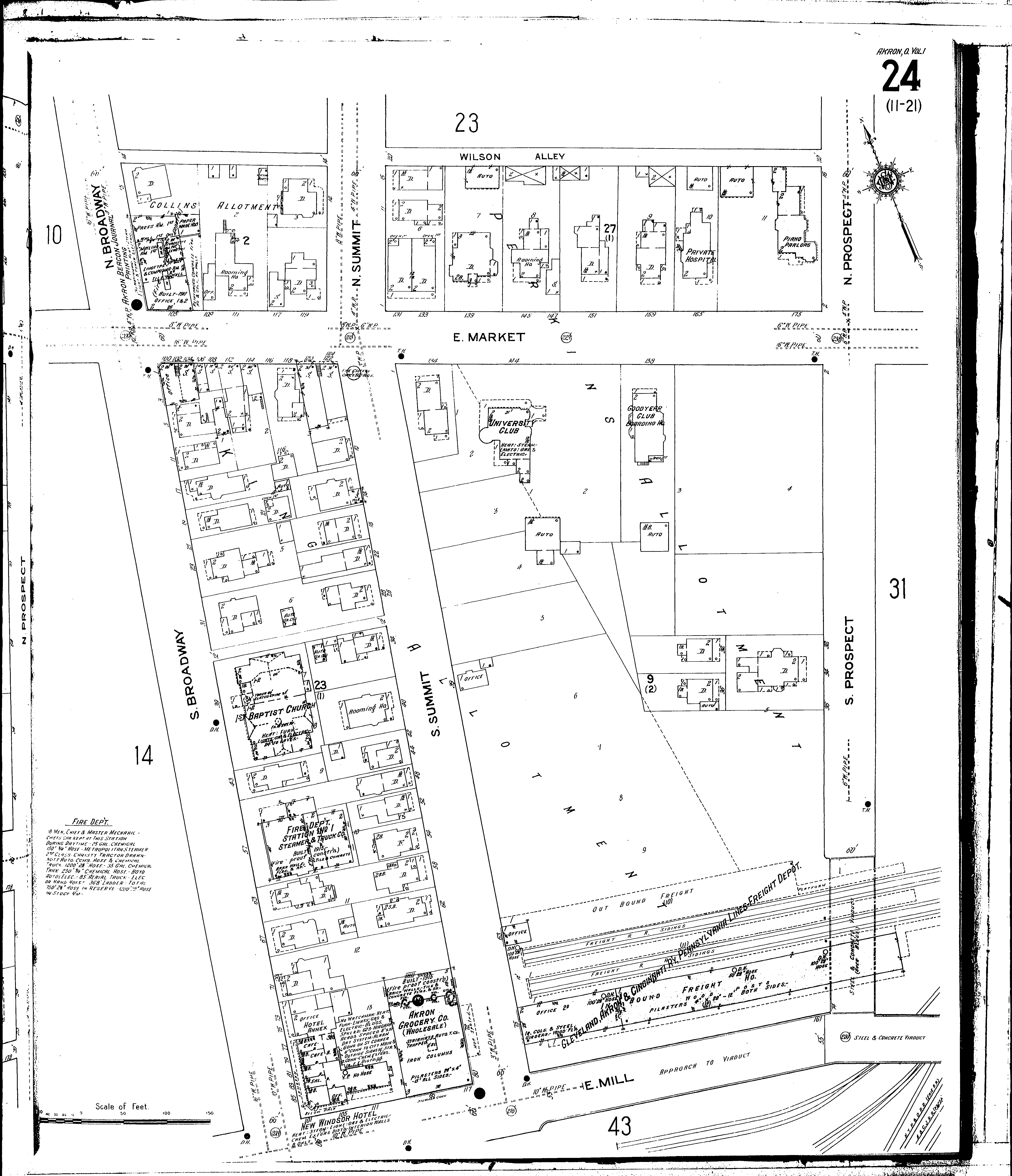 Locations: Akron Beacon Journal, Printing Akron Grocery Co., Wholesale C. A. & C. R. R. Freight Depot Fire Department, Station No. 1 First Baptist Church Goodyear Club, Boarding House New Windsor Hotel University Club House