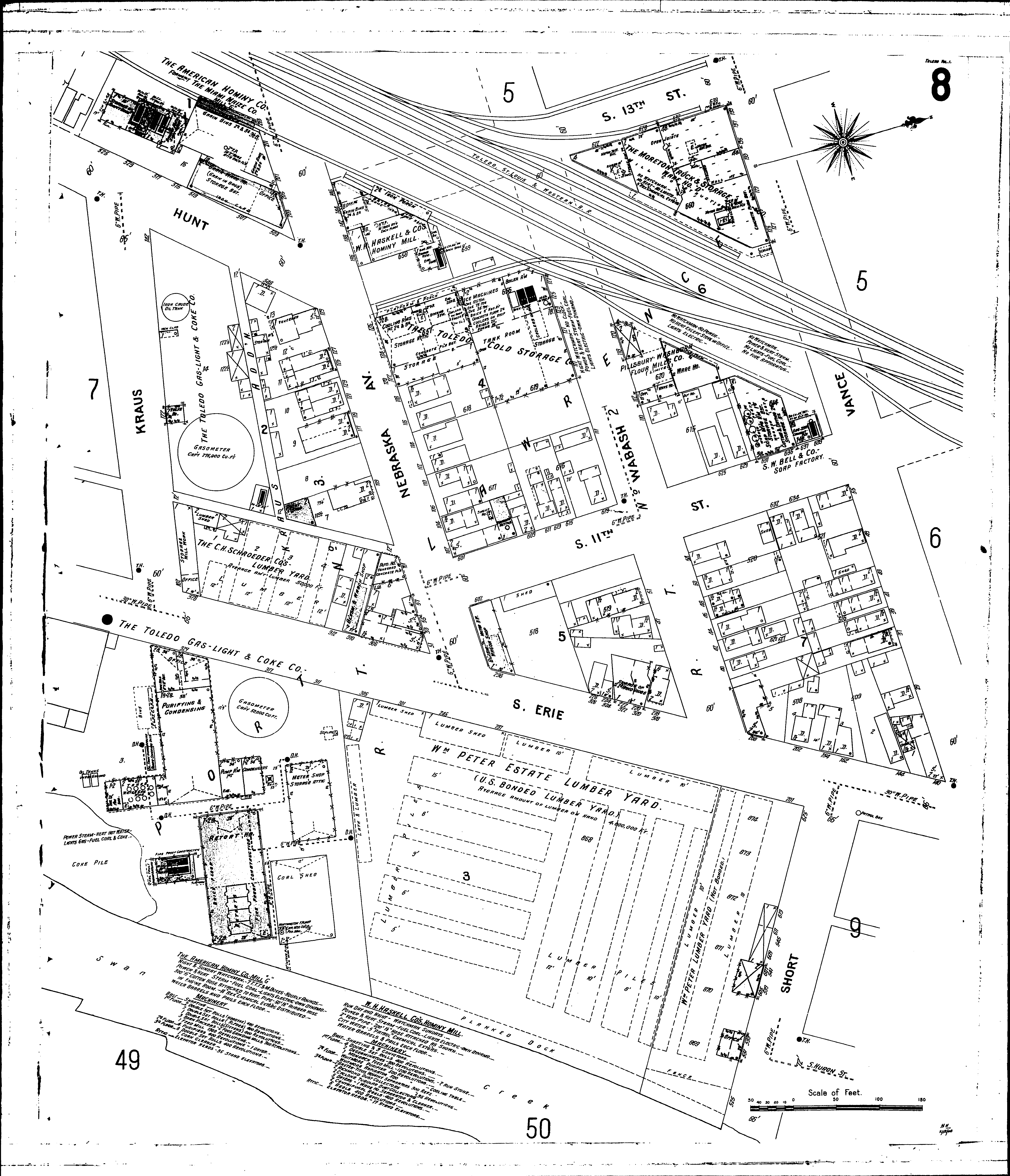 Locations: American Hominy Co Bell, S. W., & Co., Soap Works Haskell, W. H., & Co., Hominy Mill Moreton Truck & Storage Co., Wareho. āDā Peter, W., Estate, Lumber Yard Pillsbury-Washburn Flour Mills Co., W. H Toledo Cold Storage Co Toledo Gas Light and Coke Co